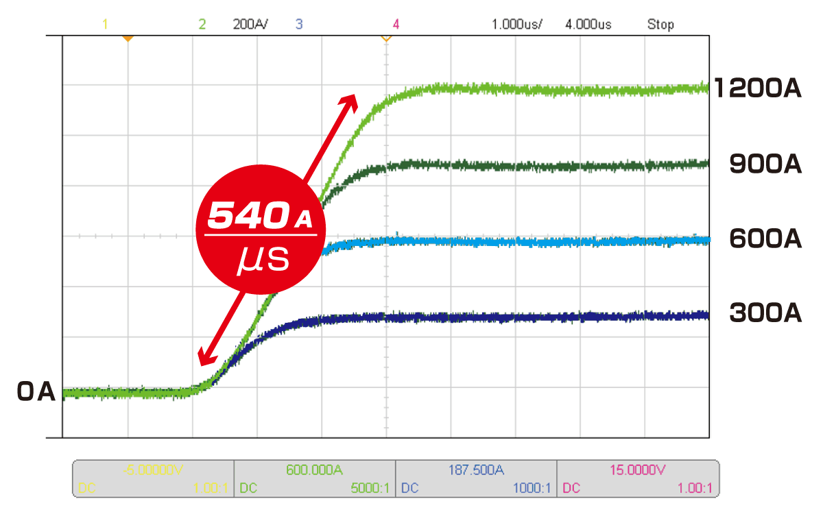 达到额定电流(*2160A)的上升沿时间为4μs。支持在电源评估中愈发重要的高速过渡响应试验。